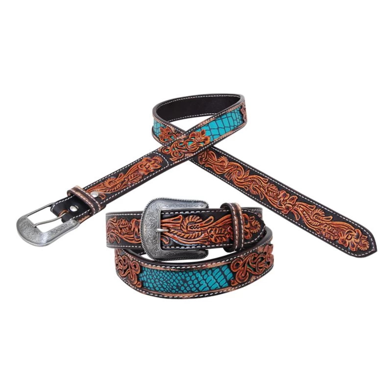 With this vibrant belt, you will be the center of attention wherever you go. It’s not just because it features a vintage finish with distressed strap, floral tooled with turquoise gator inlay, and buck stitch for that perfect balance of color – it’s also because no other belt will wear like our Circle Y belts. The perfect touch of classic details paired with a modern pop makes this belt a true keeper. Measures 1 1/2″ wide with a silver etched removable buckle. Available in sizes from 26″-44″.