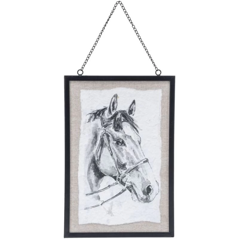 The Horse Wall Art is a great way to show your love of all things equine. This beautiful farmed wall art piece has a woven linen matboard featuring a torn edge textured parchment with greyscale horse print. It is available in two unique styles and comes complete with metal frame and refined chain hanger.