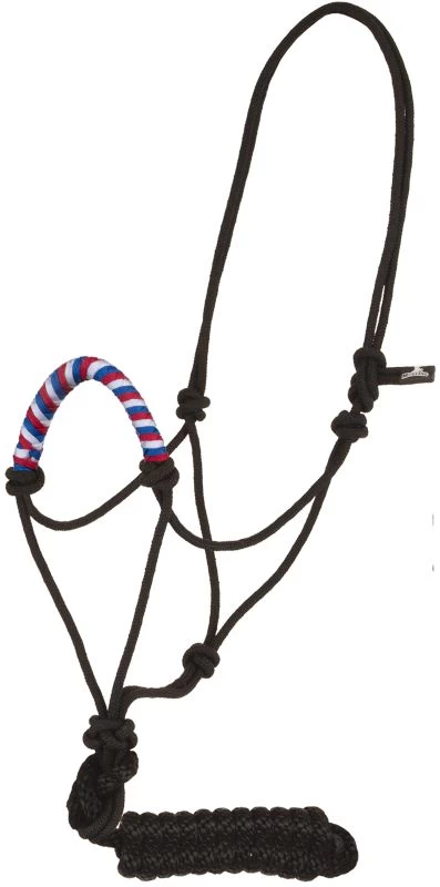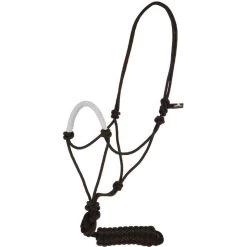 This rope halter is made from a continuous piece of rot-resistant 3/8-inch diamond-braided poly rope with a solid color nose accent and a 5/8 x 8ft. detachable lead. It’s durable and long lasting, washable, with no hardware.