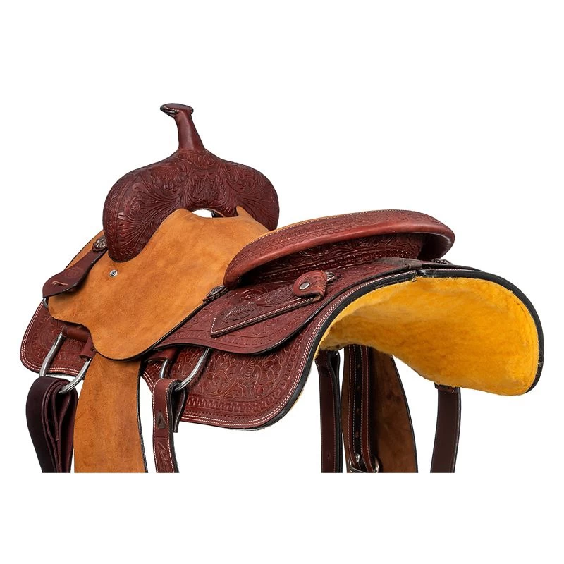 Silver Royal Canyon Ranch Cutting Saddle is built for everyday riding. Combining hand carved floral stamped oiled leather with durable scuff resistant roughout fender/jockey. Features include Tough1 Quick Change stirrup buckles, rawhide stirrups and hoof pick holder.  Saddle Package includes headstall, reins, girth, and saddle blanket.