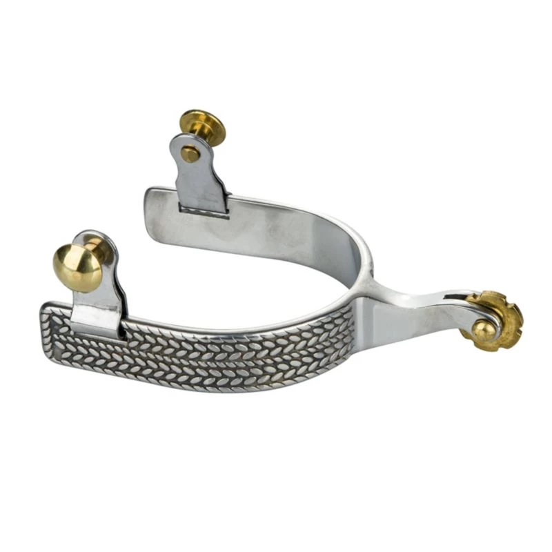 Stainless Steel Roping Spurs with 3/4” Rope Design Embrossed Band, 5/8” solid brass rowel and solid brass buttons.