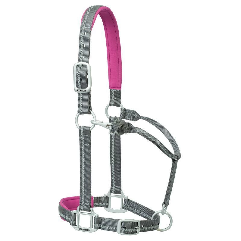 This halter has a reflective checkerboard safety stripe that boosts low-light visibility, contrasting neoprene cushioning for comfort, and brushed aluminum plated hardware.