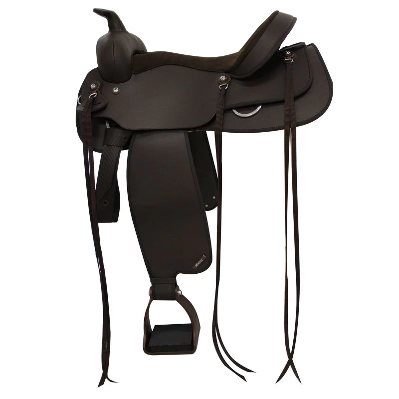 Made of Duraleather, this synthetic saddle features a softer, closer contact seat padded with memory foam, comfort ride saddle tree, cut out fenders with EZ fold feature, wide trail stirrups, longer saddle tie strings and square skirt.